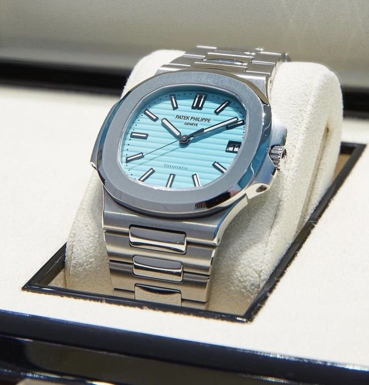 The Patek Philippe Nautilus Chain Watch is designed for those who appreciate luxury, craftsmanship, and sporty elegance. Its elegant blue or aqua green guilloché dial features applied luminous indices for enhanced readability and is protected by a scratch-resistant sapphire crystal, combining style with durability.